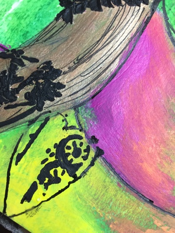 Look carefully at the top right part of her hair do. On the next pictures you'll be able to see a slight green tint, carried over by the clear gesso from her face up. But after it dried it did take all kinds of mediums well!
